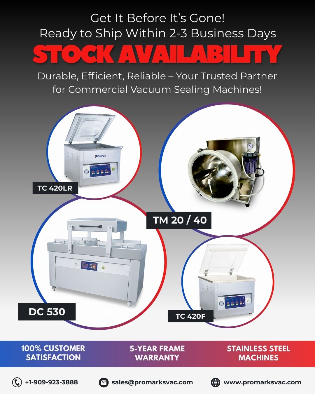 𝗖𝘂𝗿𝗿𝗲𝗻𝘁 𝗦𝘁𝗼𝗰𝗸 𝗔𝘃𝗮𝗶𝗹𝗮𝗯𝗶𝗹𝗶𝘁𝘆 Ready to Ship within 2-3 Business Days Now! Tell Us What You Need – Get a Fast Quote Contact us page FacebookThis field is for validation purposes and should be left unchanged.Name*(Required) First Last Email*(Required) Your Phone No.*(Required)Type of Business*Your Country*(Required)Machine interested *(Required) Chamber Vacuum Sealer Rollstock Thermoformer Tray Sealer Shrink / Dip Tank Vacuum Tumbling Machine Brine Injector Piston Stuffer Heat Sealer Other Your Message*(Required)Please let us know what's on your mind. Have a question for us? Ask away.CAPTCHA